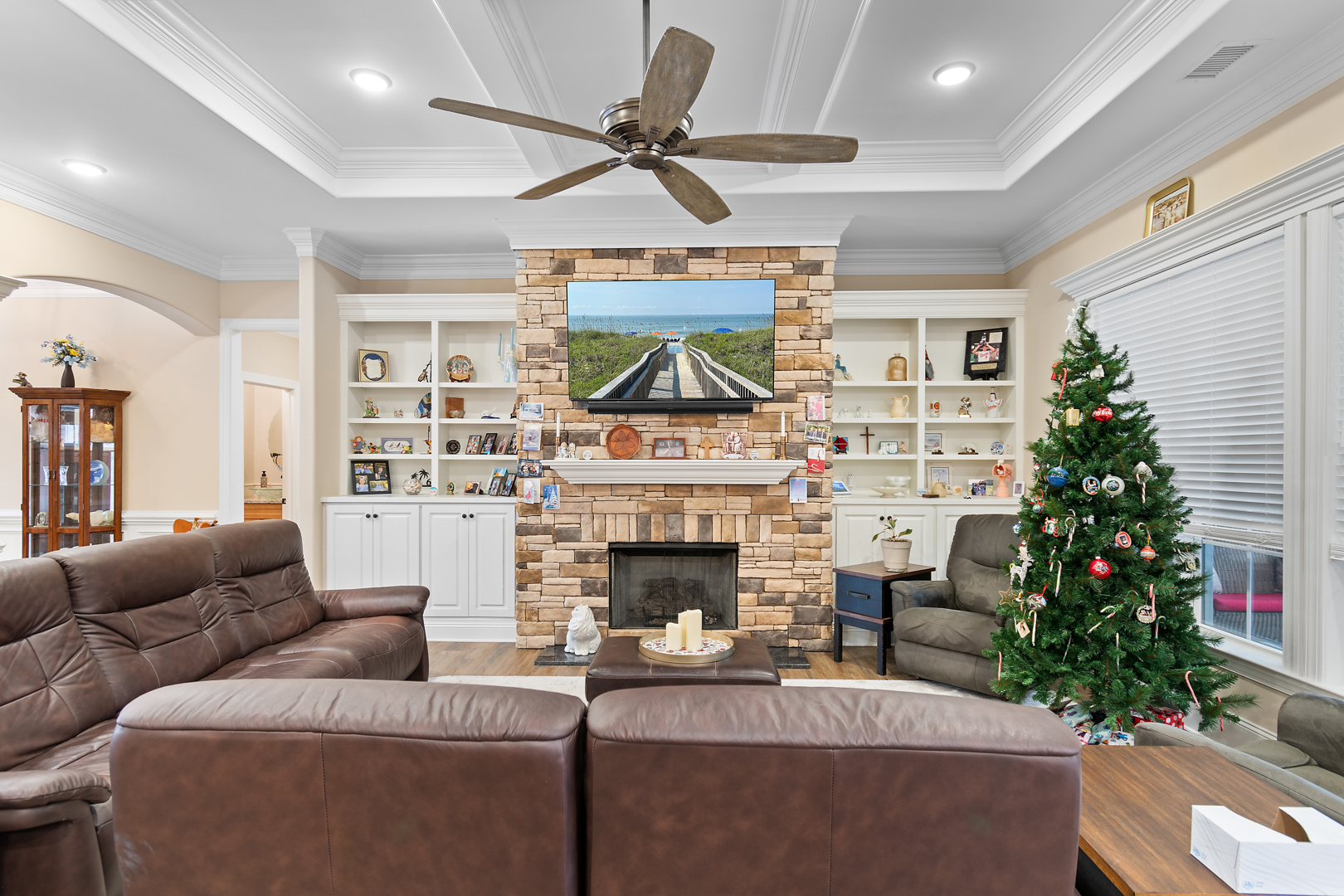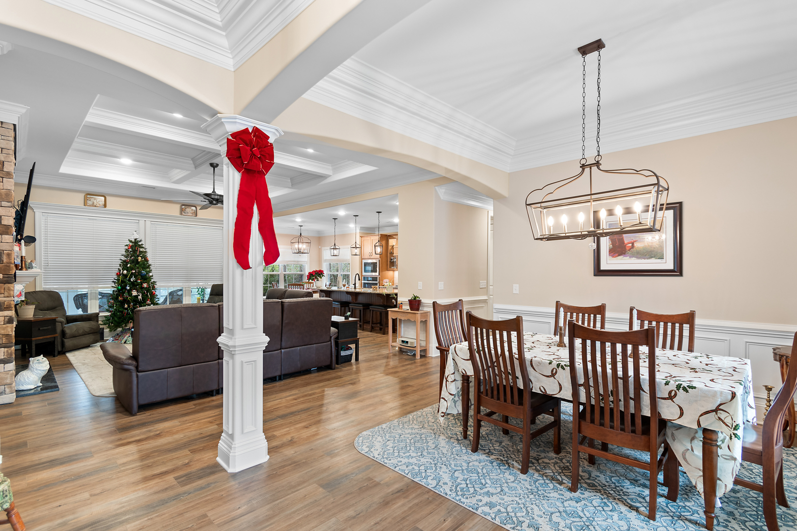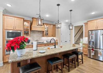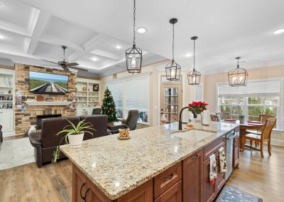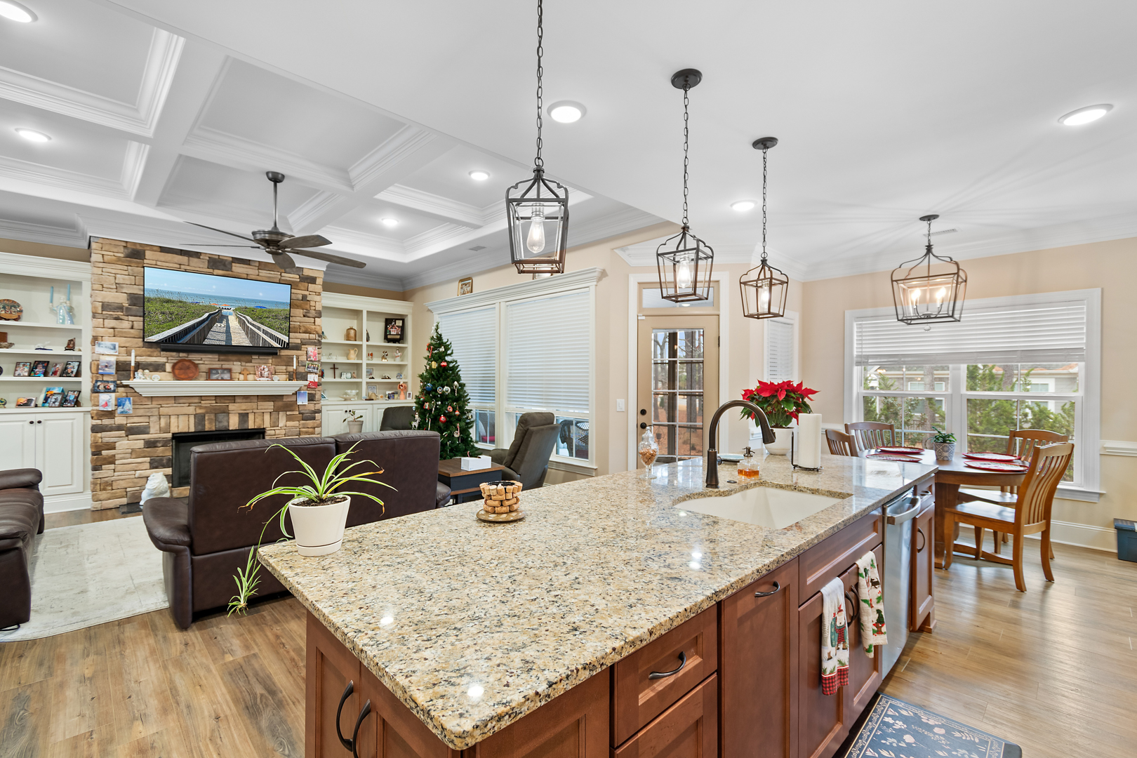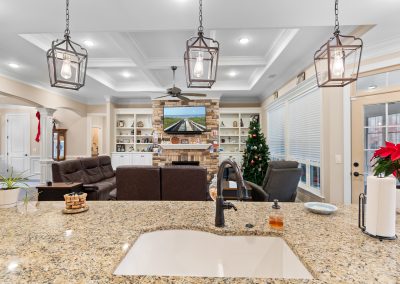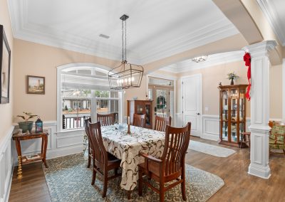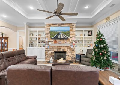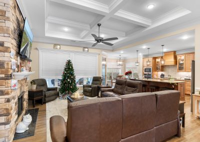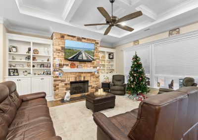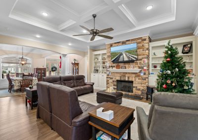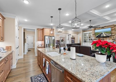 This stunning, custom-built home by Douglas Builders is ready for a new set of owners. With extremely comfortable living space and several nice extras, this is a well thought out floor plan. The spacious living room is open to the dining room and kitchen, making this a fantastic house for entertaining. A designated wet bar area with beverage cooler is adjacent to the living and dining area also. The living room boasts double crown molding, coffered ceiling and a stone fireplace wall with built-ins. The kitchen is a cook’s dream with large island, wall oven/microwave combo, pantry, gas cooktop and custom vented hood. A powder room off the living room for guests is another thoughtful touch.