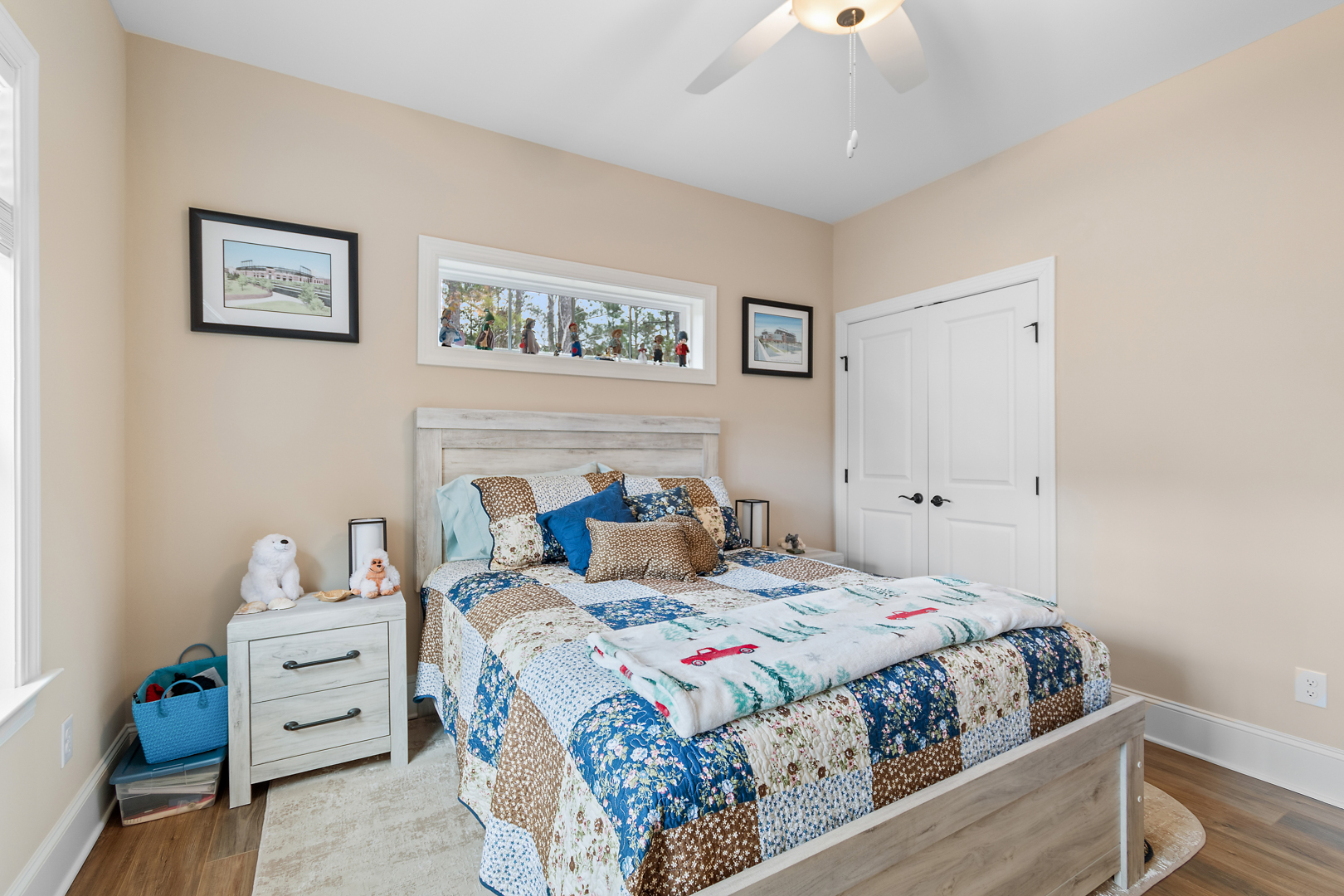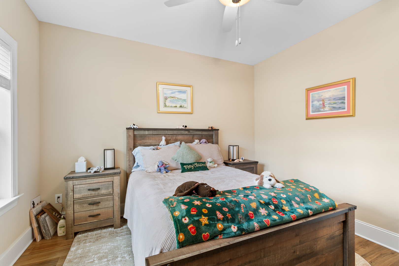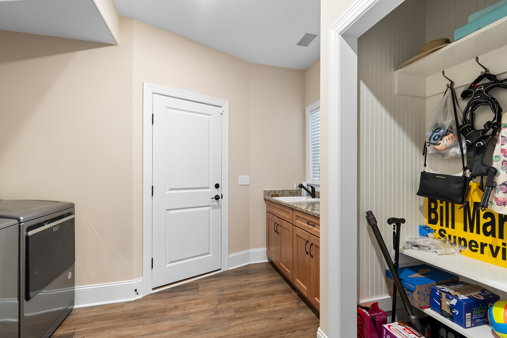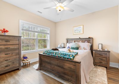 The primary suite offers plenty of space for traditional bedroom furniture. The primary bathroom and closet are also generously sized with custom closets, double vanities and a tiled, walk-in shower. With LVP throughout the first floor, cleaning is a breeze. The split floor plan means that guests have their own privacy on the other side of the home. The bonus room offers another possible guest suite option, office, or man cave. The fact that it has its own full bathroom makes it a versatile space. There is also a closet and access to the massive walk-in storage from the bonus room. This home offers an abundance of storage space! The garage is oversized with a bump-out, providing additional storage. Other nice extras in this home are an encapsulated crawlspace, gutter guards, tankless water heater and an invisible fence.