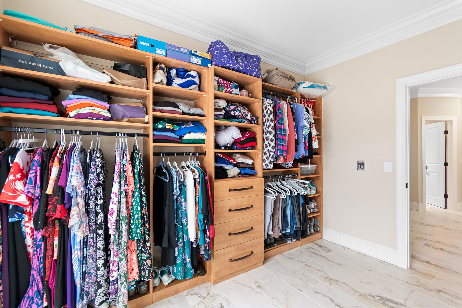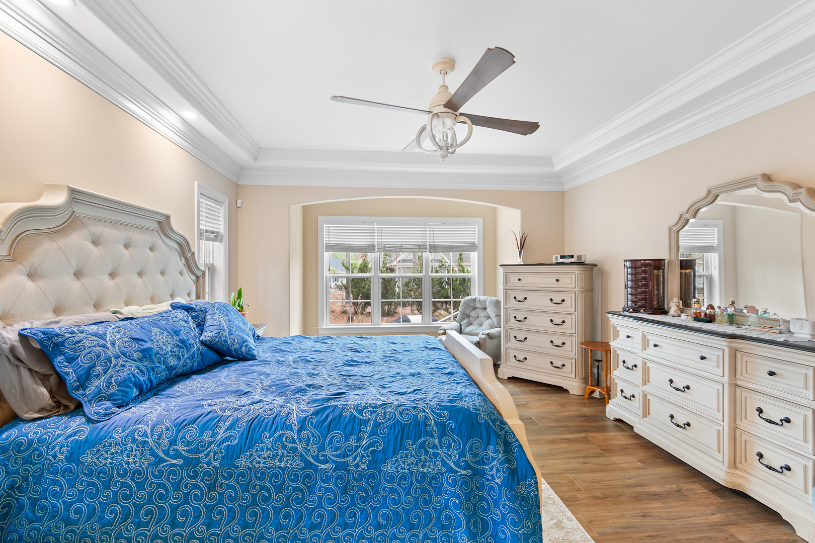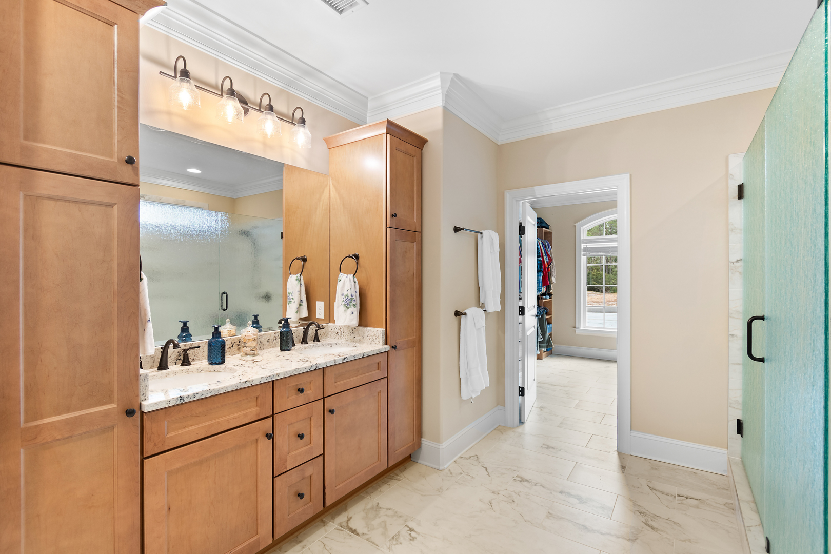 The primary suite offers plenty of space for traditional bedroom furniture. The primary bathroom and closet are also generously sized with custom closets, double vanities and a tiled, walk-in shower. With LVP throughout the first floor, cleaning is a breeze. The split floor plan means that guests have their own privacy on the other side of the home. The bonus room offers another possible guest suite option, office, or man cave. The fact that it has its own full bathroom makes it a versatile space. There is also a closet and access to the massive walk-in storage from the bonus room. This home offers an abundance of storage space! The garage is oversized with a bump-out, providing additional storage. Other nice extras in this home are an encapsulated crawlspace, gutter guards, tankless water heater and an invisible fence.