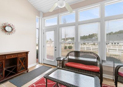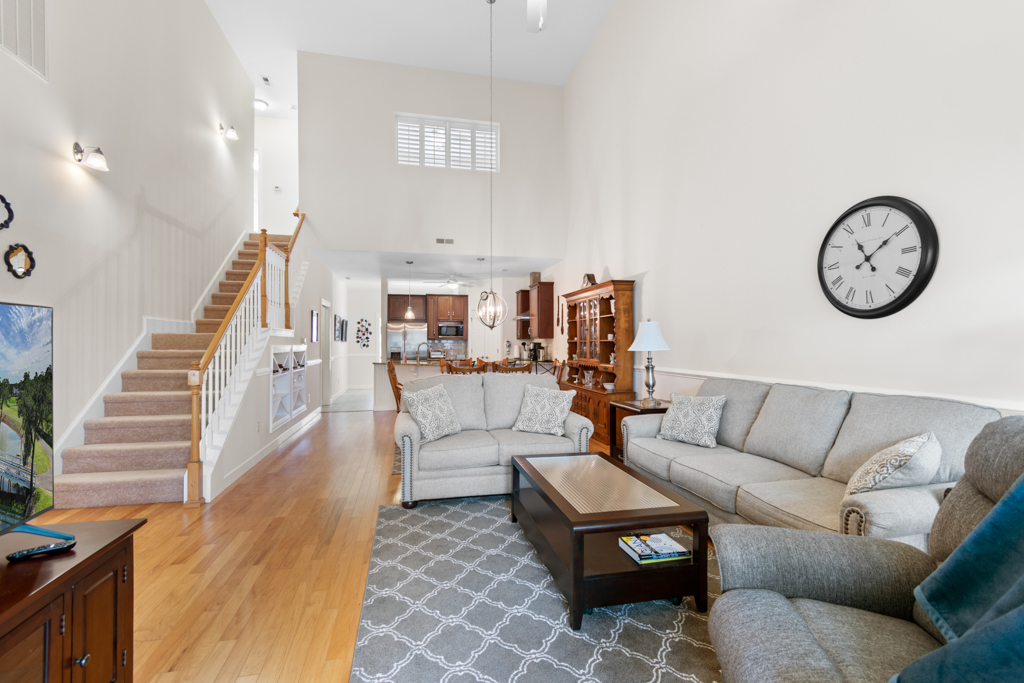 This extremely well-kept townhouse in the amenity-rich community of Brunswick Plantation is ready for a new owner! These units do not become available very often, as they have very comfortable space, a pleasant setting AND a garage. As you enter through the foyer, there is a powder room to the left and the hallway leading to the kitchen and living area. The space has an open and airy feel with plenty of natural light streaming in, and high ceilings. The kitchen and dining area are adjacent to the living room, so this setup is ideal for entertaining. Wood flooring adorns the living area and primary bedroom, with tile in the kitchen, laundry room, foyer, sunroom and bathrooms. You will love this sunroom, with its high windows and view of a grassy common area and pond.